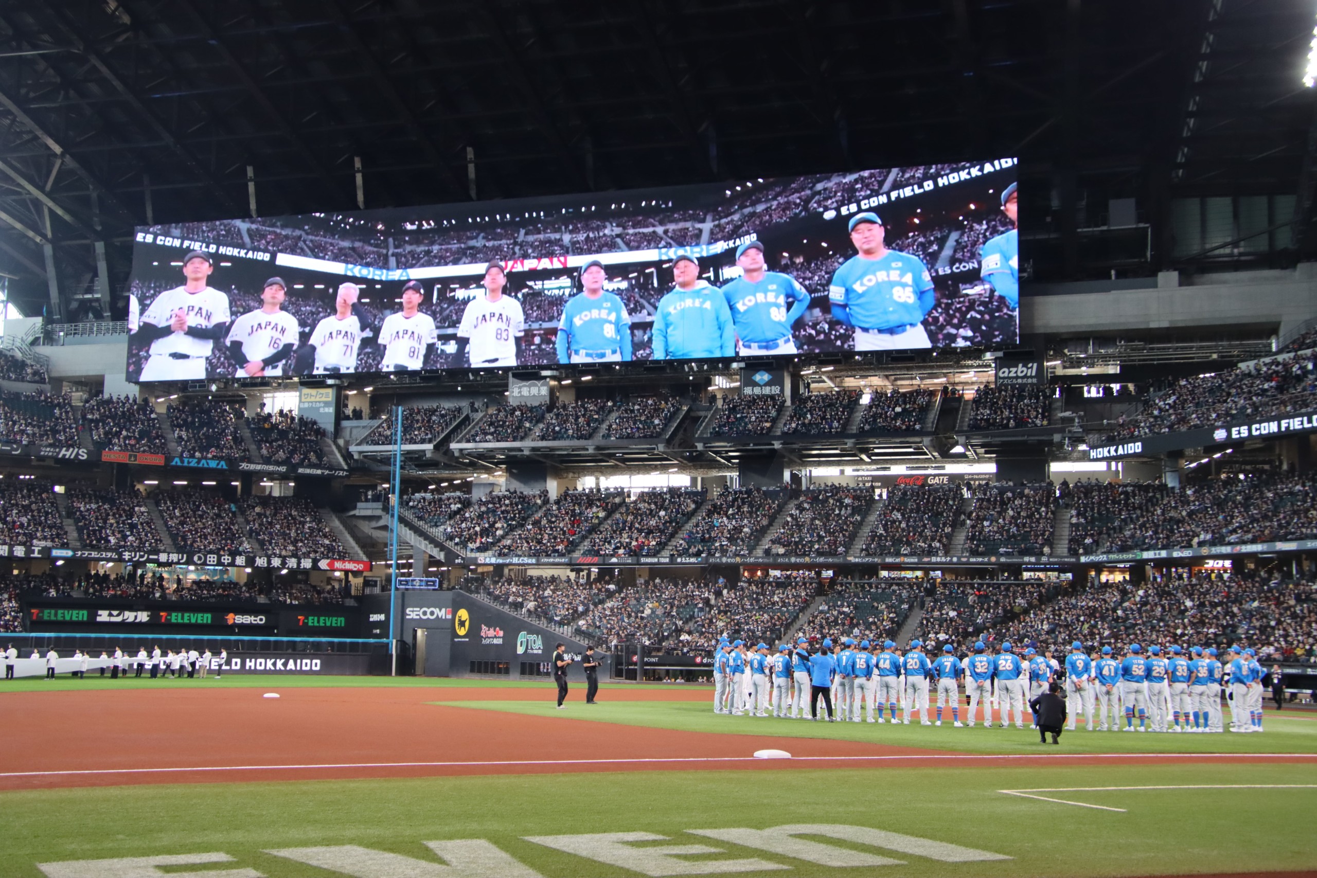 試合前のセレモニーでは両国の選手が円形に並び、肩を組み合った。絆が固く結ばれていることを表現しており、球場はさらに一つになる。