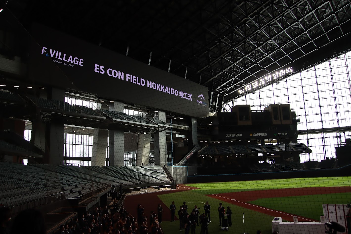 そして1月4日に「ES CON FIELD HOKKAIDO」は竣工。翌日に晴れて竣工式を迎えた。谷口さんら球団スタッフもグラウンドでその門出を祝った。1年間、工事現場の時からこの姿をイメージして発信を続けただけに喜びもひとしおだった。
