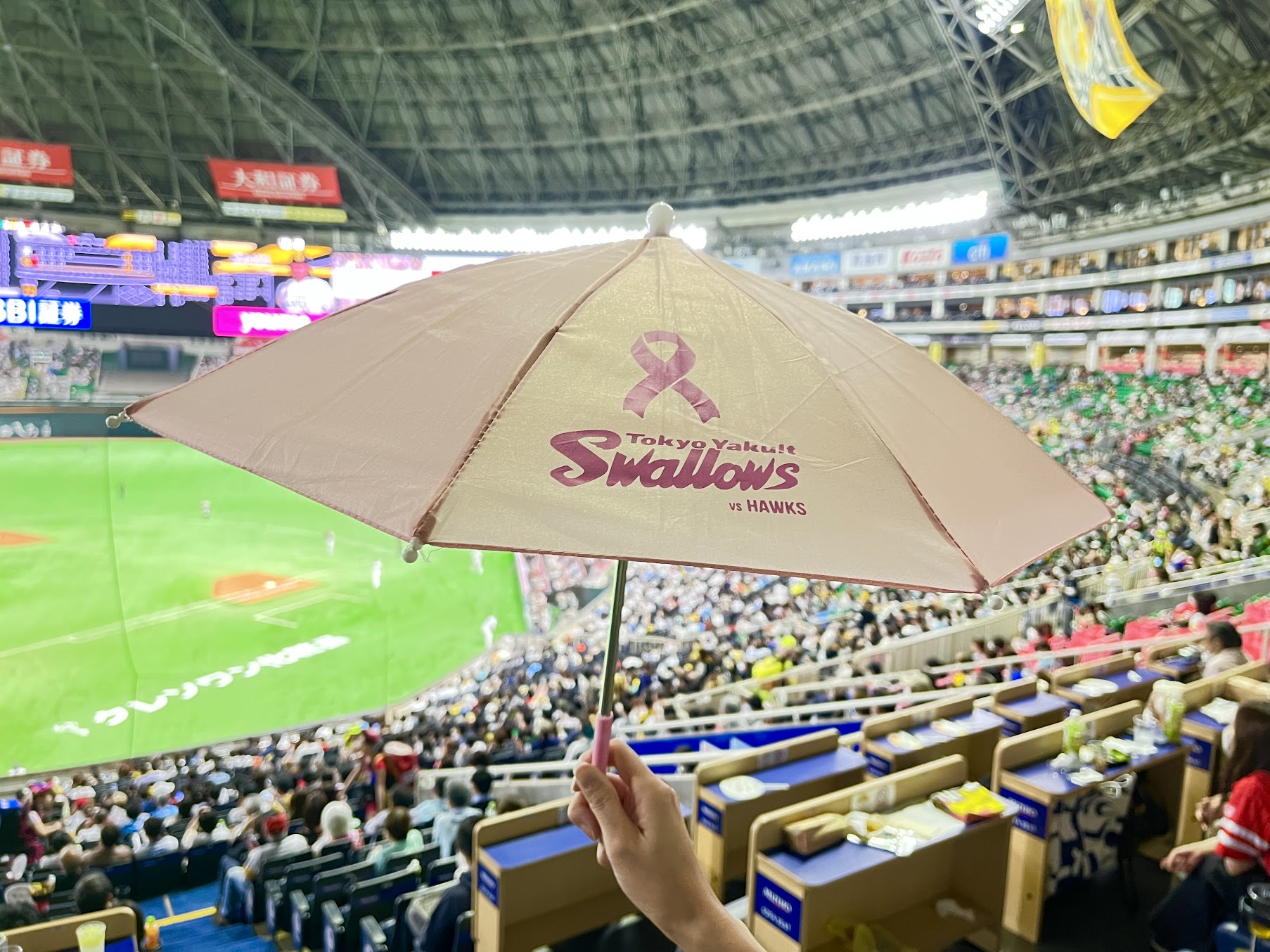 スワローズが得点した際には東京音頭で傘が振られる。この試合では、イベントに合わせて制作されたピンクの傘がレフトスタンドで上下に揺れ、球場全体がピンクに染まった。