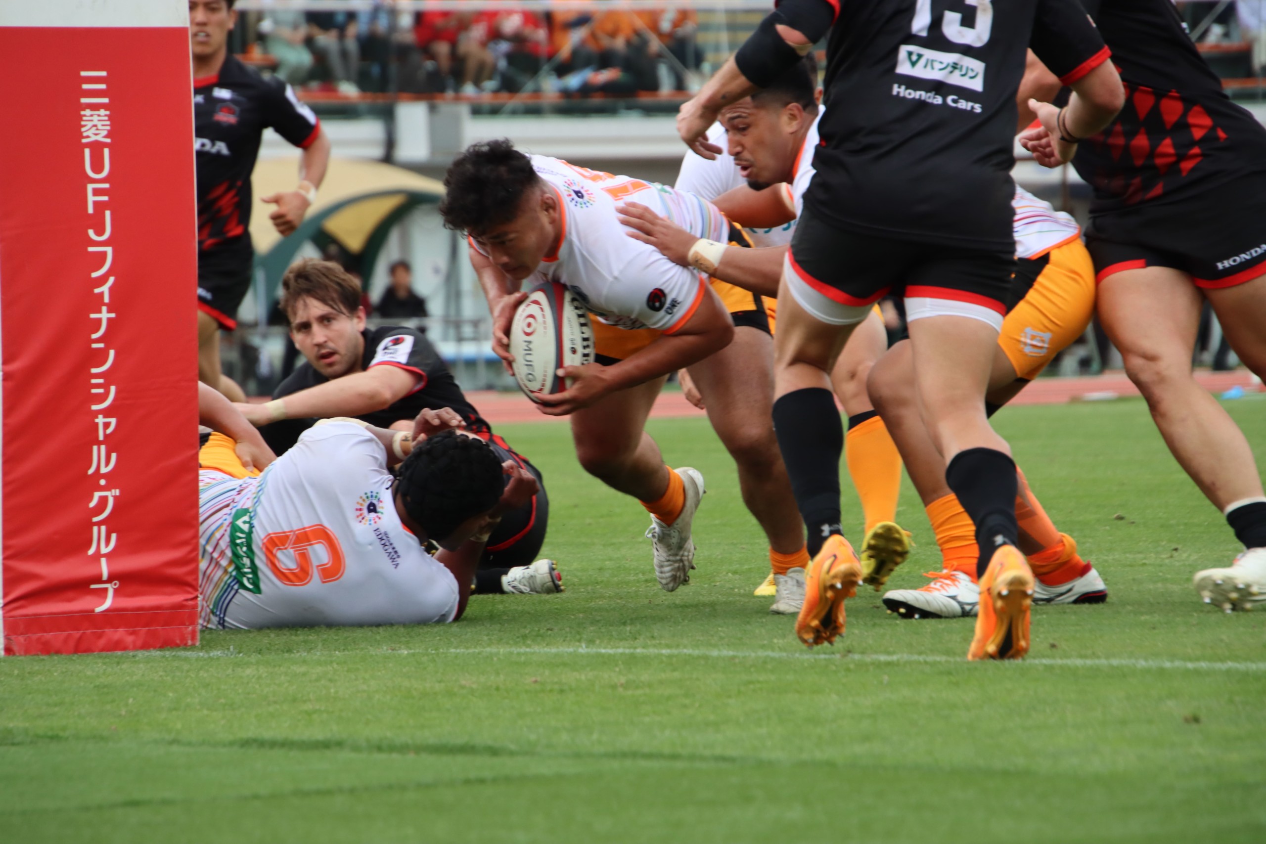 ここからはS東京ベイのトライラッシュに。ヘルが得意のフィジカルでゴールラインに迫ると、フォーリーが藤原からのパスを受け飛び込んだ。