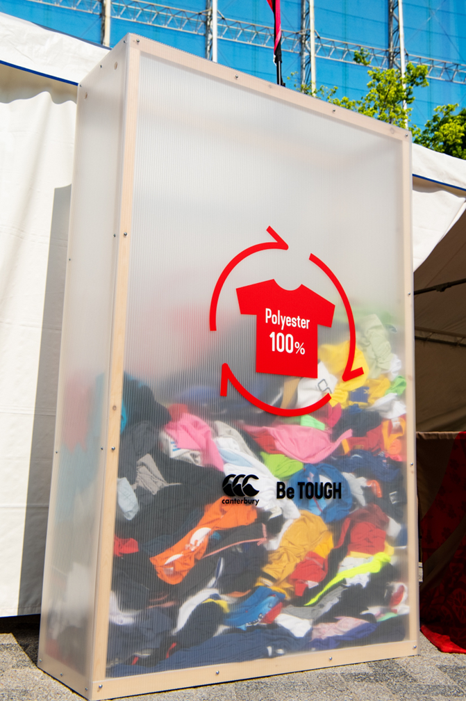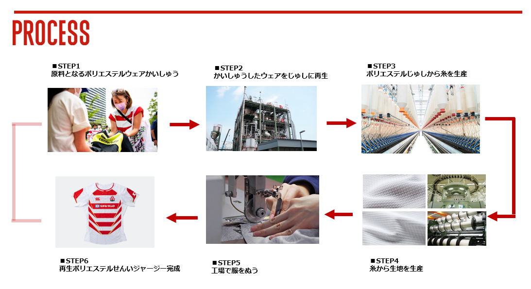 ジャージーの開発プロセスは、全国のラグビーファンの方々からリサイクルとして供給していただいたウエアを原料化し、選手の着用する新ジャージーとして再生するというもの。