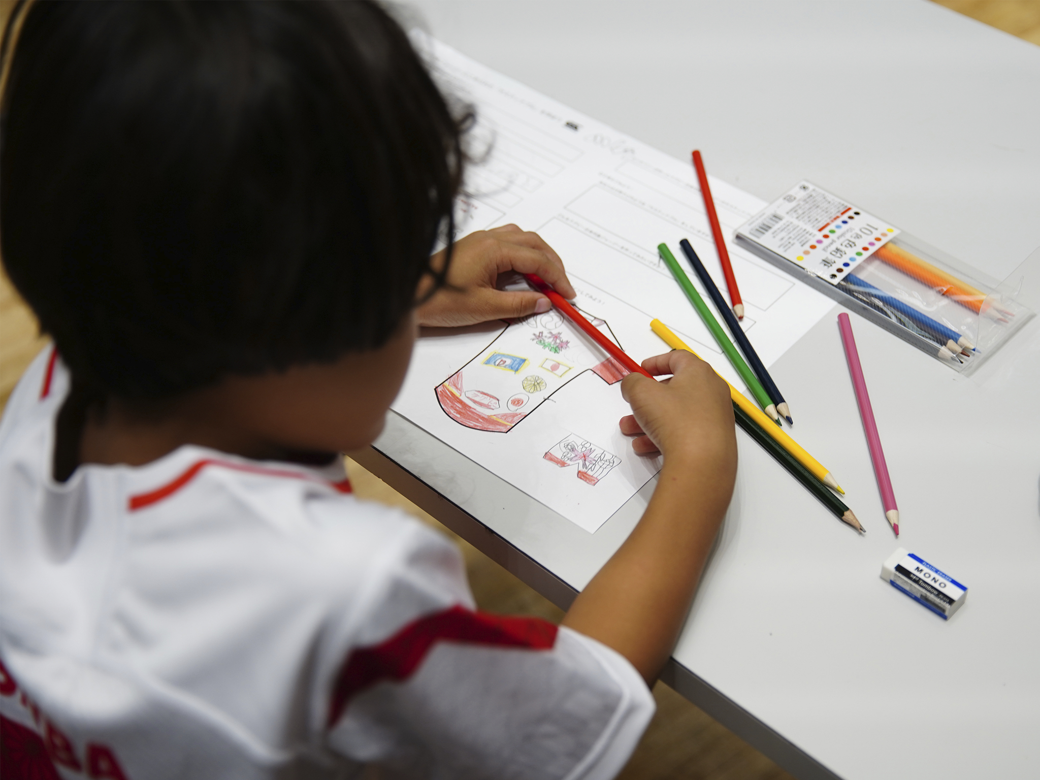 この間、子どもたちは配布されたワークシートにそれぞれ学んだことや気づいたことを記入、イベントの最後には、それぞれが考える「サステナブルな日本代表ジャージー」のデザインを描いた。